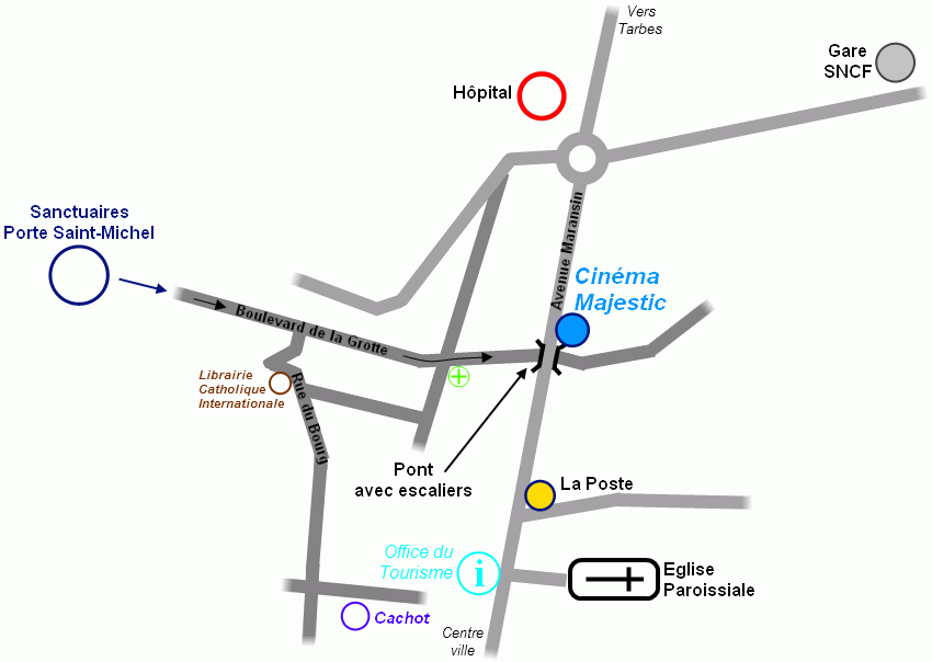 En partant des Sanctuaires par l'entrée principale, la Porte Saint-Michel, il suffit de remonter le Boulevard de la Grotte jusqu'à la Maison Paternelle de Bernadette, et à cet endroit prendre la rue du Bourg sur la droite, la librairie est située non loin de là, au bas de la rue du Bourg, au numéro 79. On peut bien sûr venir par un autre chemin.